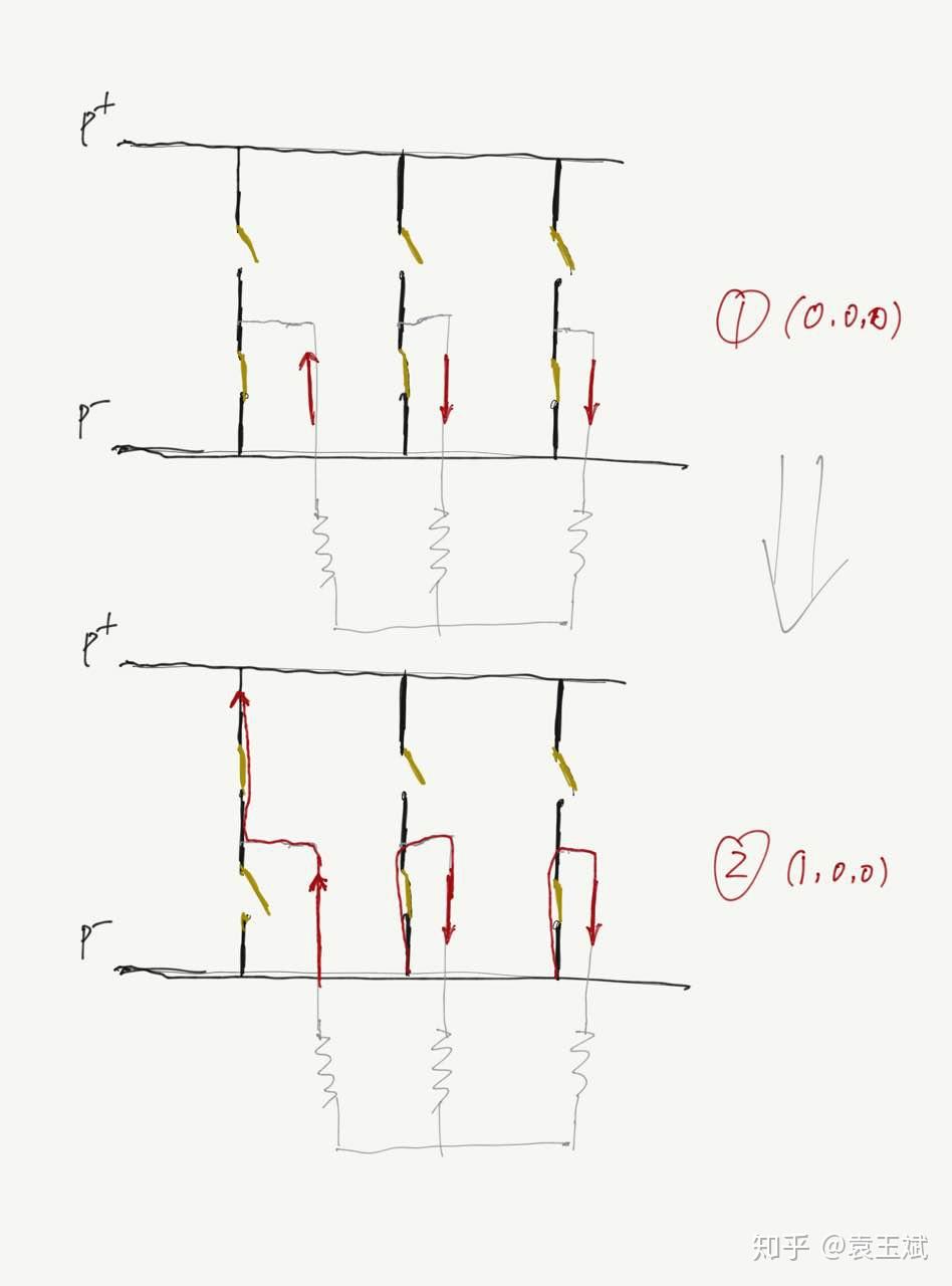 我们看7断式的svpwm,看上图1中的U0和U7,我们会注意到,U0是上桥mos全开,U7是下桥mos全开的过程,这个过程等于短路了电机的三个相线,这时候,如果电机在旋转,反电动势不为0,那么这时候反电动势是加在电机内阻上的,电机相线里面就会自己产生电流的(可以参考下图2中的三相桥臂,1表示上桥的开关合上了,0表示下桥的开关合上了);